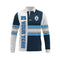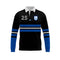 Design Your Own Custom Canterbury style Knitted Long Sleeve Rubby Jersey with Coast 2 Coast Sports. This design has traditional stripes around the abdomen, elbows and cuffs. Easily change the colours and add logos on this example template. On the front you can upload your school emblem or mascot if you like. The back has a bigger blank area where you can put a big school name or team name, or the year number of your graduation just as an idea.